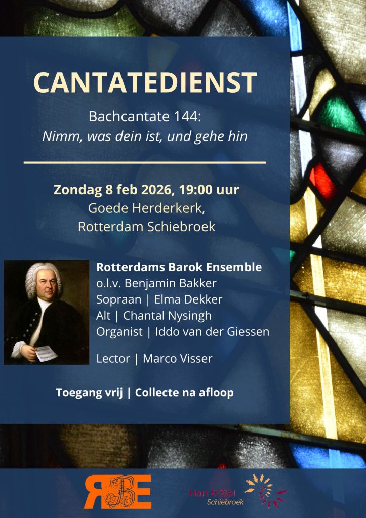 Op zondag 8 februari, 19:00 uur, is er een uitvoering van een Bachcantate in de Goede Herderkerk. Net als eerder zingt het Rotterdams Barok Ensemble onder leiding van Benjamin Bakker, zij repeteren wekelijks in onze Goede Herderkerk. Begeleid door een strijkorkest voeren zij de cantate ‘Nimm, was dein ist, und gehe hin’ BWV 144 uit, die past op deze negende zondag voor Pasen. Elma Dekker en Chantal Nysing verzorgen de vocale solo’s. Marco Visser omlijst de cantate met passende lezingen en Iddo van der Giessen begeleidt de liederen en speelt Bach voor en na de dienst. Kom genieten van dit samenspel van woord en muziek, zoals alleen Bach dat kon. De dienst is vrij toegankelijk, uw vrijwillige bijdrage wordt gewaardeerd. Van harte welkom, voor heel de buurt.